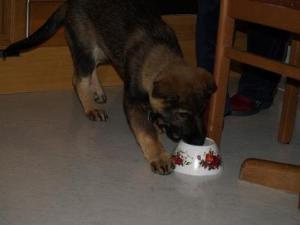 Flint beim Spielen in der Küche im Alter von 12 Wochen.